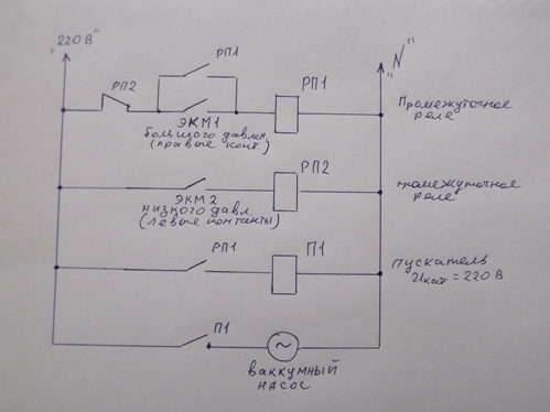 Вложение Вот схема, кот раб след образом: до включения вакуумного насоса через замкнутый контакт ЭКМ "Большое давление" включается РП 1, кот ввключает пускатель П 1 и запускается вакумный насос. Контакты ЭКМ Заблокированы контактами РП1. Набирается вакуум до момента замыкание контактов ЭКМ "Низкого дамвления" Эти контакты можно блокировать можно не блокировать поскольку импульсным срабатыванием РП 2 Обесточивается РП 1 и вакуумный насос останавливается до момента потери вакума и очередного срабатывания рп1. Вложение Схема с защитой контактов ЭКМ минимального давления. Также можно дополнительно для защиты от электроэрозии слабых контактов Манометра подключить паралельно контактам ЭКМ бумажный конденсатор на 1 мкФ 400 в. Всё это обеспечит долгую, недребежащую работу ЭКМ. |