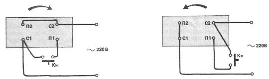 Чтобы изменить направление вращения трехфазного электродвигателя, включенного в однофазную сеть по схеме «звезда» (см. рис. 2, б), нужно третью фазную обмотку статора (W) подсоединить через конденсатор к зажиму второй обмотки (V). Направление вращения однофазного двигателя изменяют, поменяв подключение концов пусковой обмотки П1 и П2 (рис. 4).