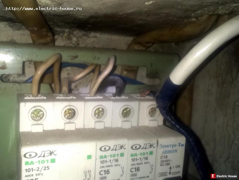 На крайний справа автомат (с черным тумблером) подключена стиральная машина также ПВСом 3х2.5. При этом одна из трех жил (черная) ушла на верхнюю клемму автомата (фаза?), а остальные (синяя ноль и коричневая земля) путем скрутки на толстый синий аллюминий уходящий за щиток и приходящий на нижнюю правую клемму крайнего слева двойного автомата на 25A\4500. Из этой же клеммы уходит за щиток толстый белый аллюминий. На тонкий белый проводок внимания не обращаем - это подсветка шкафа купе также брошенная одной из жил (на фазу?) "стирального" автомата. Все остальные автоматы тут на 16A\4500.