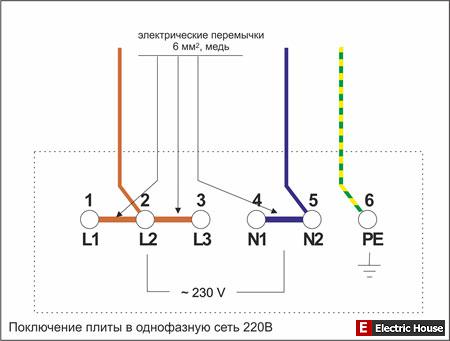 Между клеммами 1-2-3 и 4-5 должны ставиться медные перемычки сечением 6 мм2, современные электроплиты уже продаются с такими перемычками в комплекте. Фазную жилу (коричневого, черного или серого цвета) подключаем к клемме 1,2 или три. Нулевую (синего цвета), соответственно, к клемме 4 или 5. Заземляющую жилу желто-зеленого цвета подключаем к клемме номер 6. Обязательно убедитесь в том, что болты клемм затянуты до упора, если соединение будет некачественным, возможно обгорание клемм, вплоть до пожара. Если используется безрозеточное подключение, то в клеммной коробке соединяем клеммами жилы соответствующих цветов. Не забывайте проверять натяжение болтов к клеммах! Если вы используете розеточное соединение, то в розетке и вилке фазная жила подключается к клемме L, нулевая жила к клемме N, а жила защитного заземления к клемме с обозначением PE, earth или с рисунком заземления.