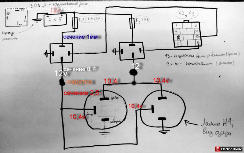 Добрый вечер всем, подскажите у меня идет потеря напряжение на фары, сделал прямое подключение через акб, подцепил все верно но вот на выходе потеря идет почти 1,5вольта, аккумулятор выдает 12в, после реле так же остается 12 в, но вот когда подключаю проводку на фары сразу идут потери, расстояние провода которые идут на фары 50см и 1.2м, подскажите почему так у меня? От акб до реле идет провод сечение 1.5мм, на самом реле маленький провод сечением 0,7мм, к нему уже скрутил провод сечением 2,5мм. Может ли это быть из за разного сечения?